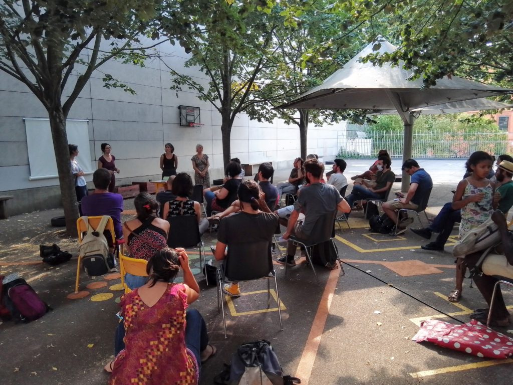 Réunion associative dans la cour de l’école.