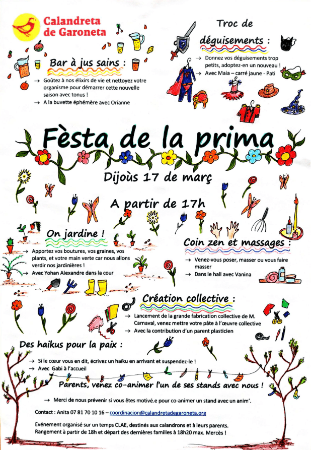 La calandreta va fêter le printemps! Les parents sont invités à participer à partir de 17h avec nous, les animateurs du CLAE vous ont préparé des petits ateliers thématiques!