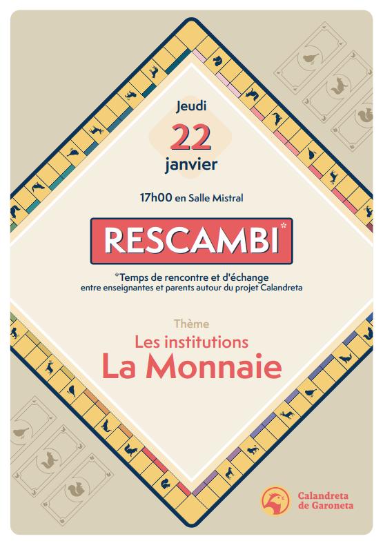 Moment privilégié dans le fonctions des Calandretas, un rescambi est un temps d’échanges entre les différent.e.s acteur.rice.s de l'école (enseignantes, animateur.rice.s et parents) autour d'un thème lié au projet d'école (langue et immersion, pédagogie, s'associer pour faire école, culture). En janvier, un rescambì portera sur les institutions de la pédagogie…
